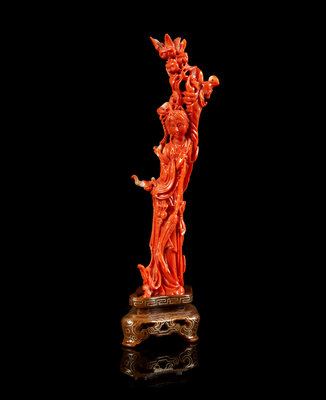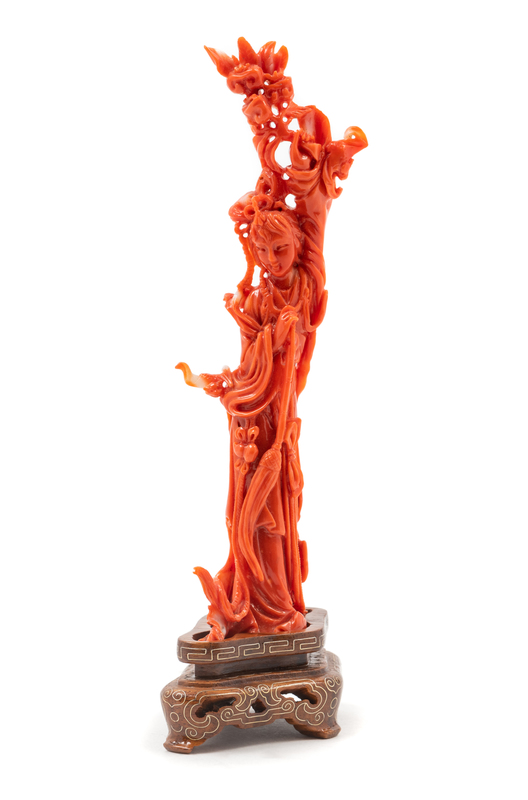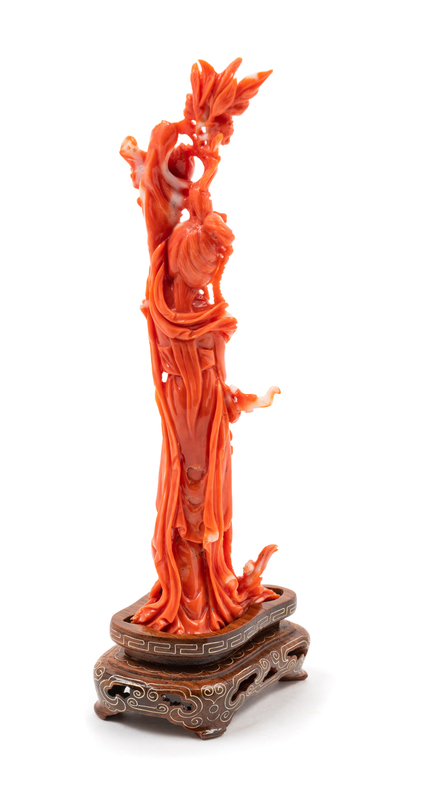 depicting a lady standing dressed in draped robes, her right hand bearing a fly whisk and her left hand raised holding a lingzhi sprig with a bat atop, further raised on a fitted silver inlaid hardwood stand.