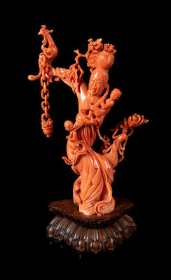 A Red Coral Figural Group of a Female Immortal and Two Boys