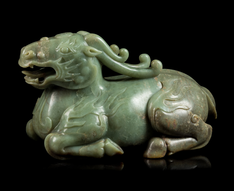 A Celadon Jade Figure of a Recumbent Qilin