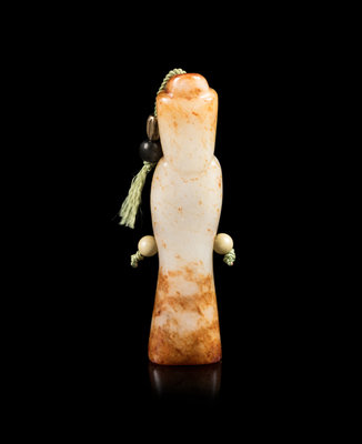 the standing figure is wearing a long robe with hair pulled up into a knot, the stone is of a white tone with dark russet inclusions to the top and bottom.