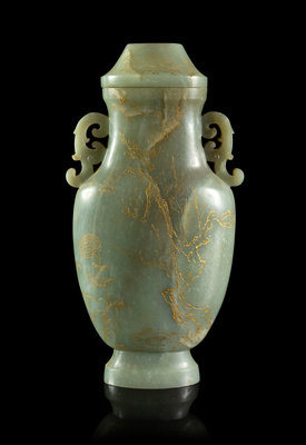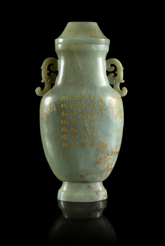 清十九世紀 青玉描金梅花紋御題詩雙螭耳蓋瓶