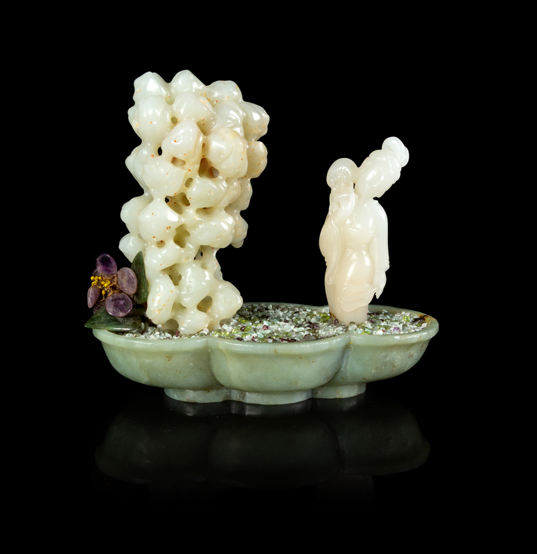 of floriform, holding a small vertical scholar's rock and a standing figure of a male.