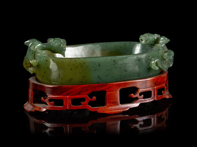 of oval form with deep sides, set with a pair of openwork chilong handles, each detailed with long bifurcated tails, with front paws and heads peering over the rim, the stone of greyish green tone with scattered inclusions and dark spots.