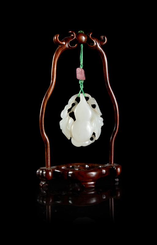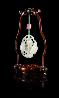 carved in openwork of a pair of double gourds borne on a sinuous leafy vine with two smaller gourds at aside, surmounted by a pink tourmaline bead, suspended from a hardwood stand.