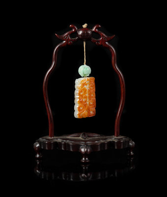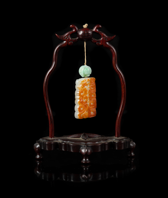 of rectangular form, pierced and carved to show a pair of sinuous chilongs, together with a reticulated jadeite bead, suspending from a hardwood stand.