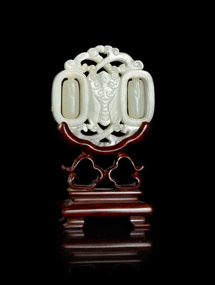 pierced and carved in the form of a winged butterfly enclosed by ruyi clouds, the stone of an even pale celadon color with natural icy white patches, raised on a fitted hardwood stand.