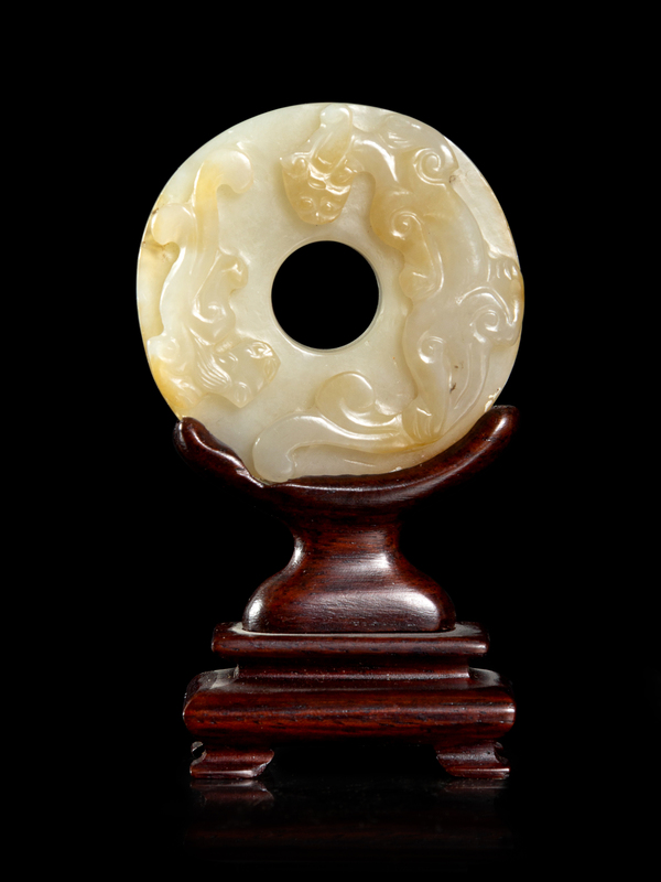 carved with two sinuous chilongs to one side, the other with raised bosses, the stone with an even pale celadon color, raised on a fitted hardwood stand.
