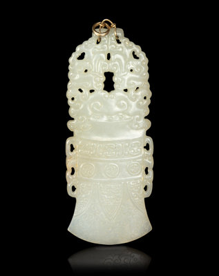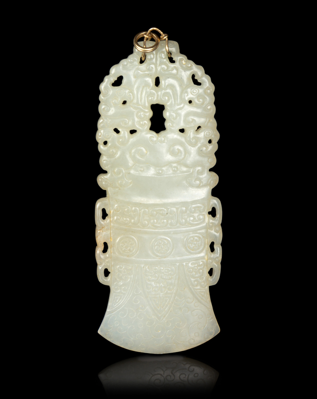 carved in the form of a bell, decorated with detailed lappet leaves and ruyi heads, surmounted by a pair of confronting chilongs.