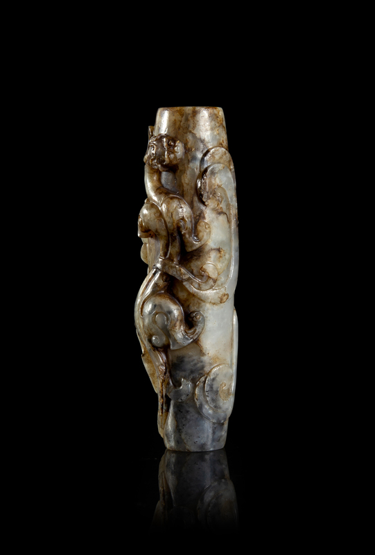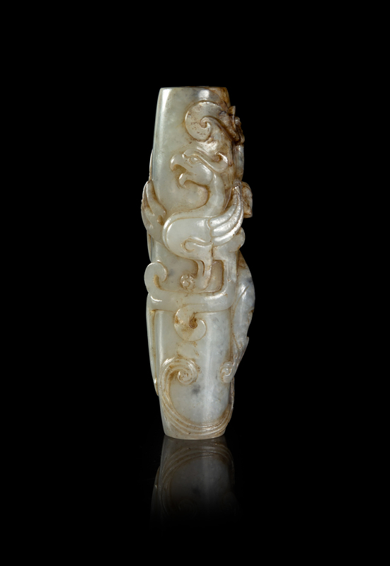 A Black and White Jade ‘Chilong’ Tubular Pendant