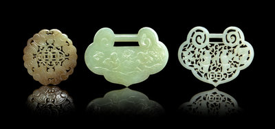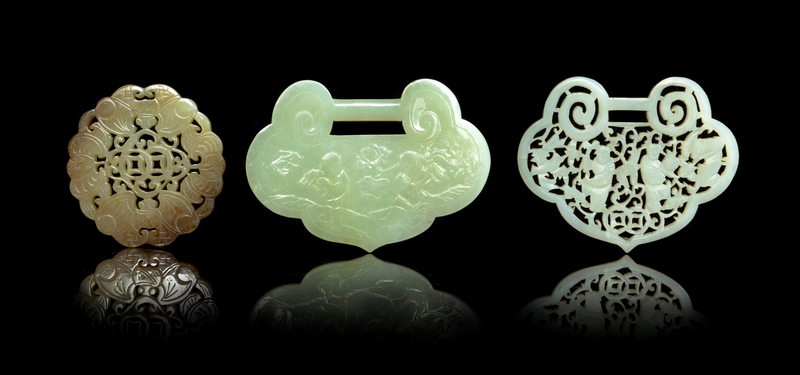 the first of ruyi-lock-form reticulated with floral scrolls and coins, the second of ruyi-lock-form carved in low relief of peony branches, the third of circular form carved in openwork of coins and bats.