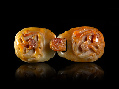the hook rendered in the form of an archaistic chilong, facing a clambering chilong, the other section of the buckle of corresponding clambering chilong, the stone of celadon color with russet patches.