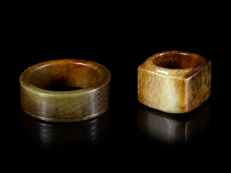 the first of tubular form, the exterior incised with a cell pattern, the second of flattened square section, carved with a cylindrical tube extending to either end, each stone of greyish-celadon and dark brown tones