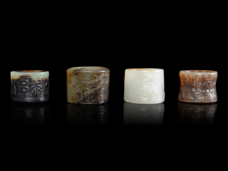 comprising a white jade example, with minor russet skin, carved in low relief showing an equestrian chasing a deer, two dark brown and celadon jade examples, one carved with C-scrolls, the other characters, a russet jade example, carved with C-scrolls.