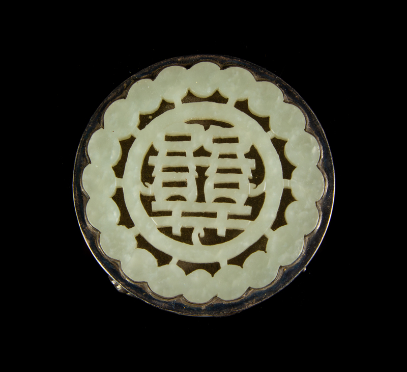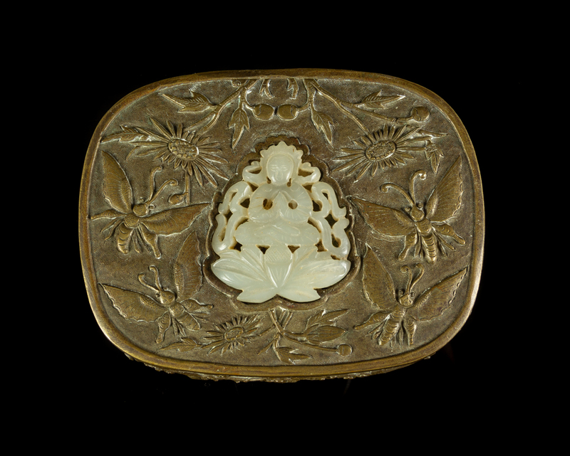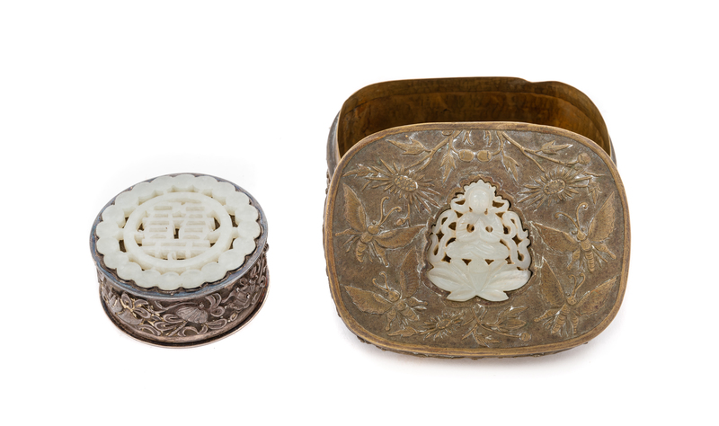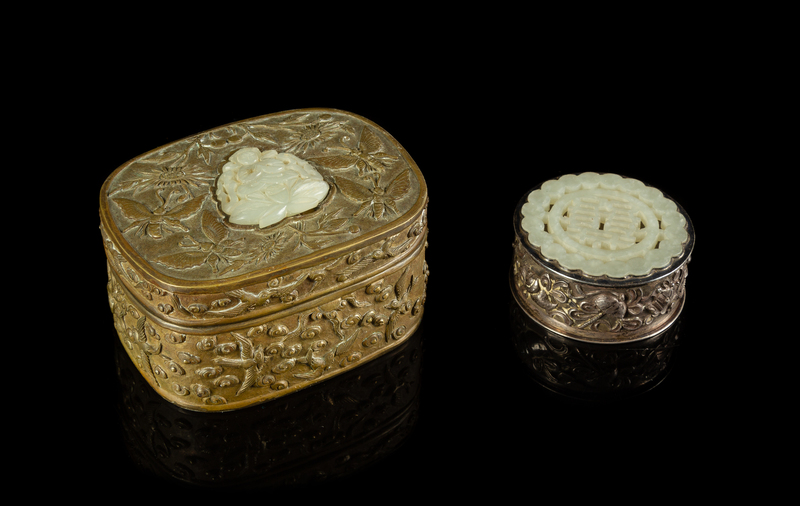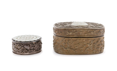 the first a brass covered box, of rounded rectangular form, the cover inset with a reticulated jade plaque in the form of seated Guanyin, chased with butterflies and chrysanthemum blossoms, the sides with birds in flight amongst clouds; the second a silver circular paperweight, the top inset with a pierce carved jade plaque showing a double happiness character, the sides chased with eight ribbon-tied Buddhist emblems.