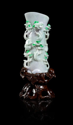 清晚期 翠玉雕松鶴延年花插帶木座