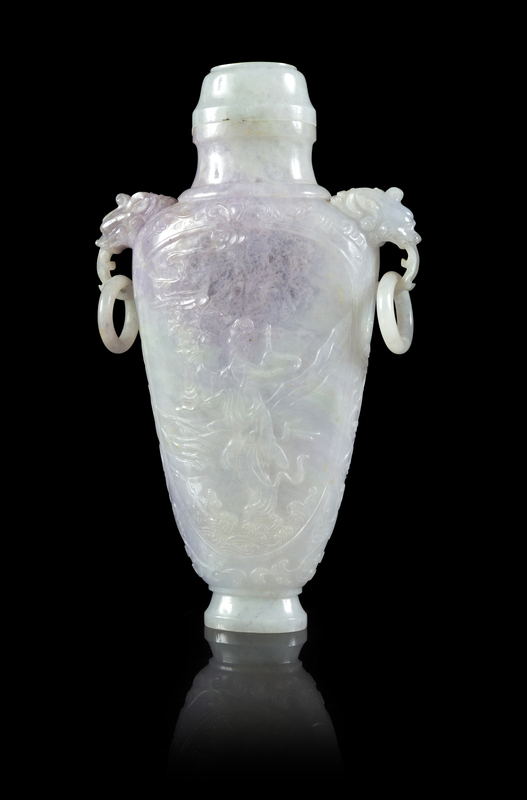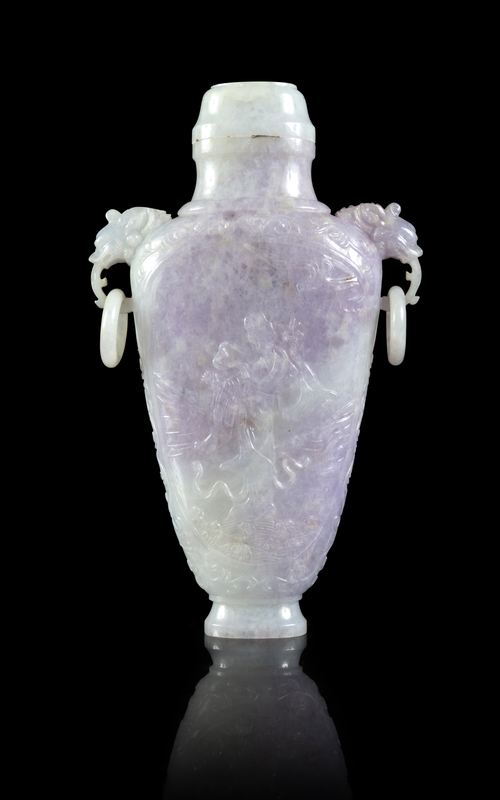 A Lavender and Pale Celadon Jadeite Doubled Dragon Handled Covered Vase