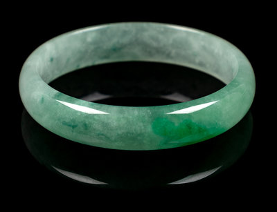 of highly translucent icy tone with patches of emerald green color, rounded to the outside and flattened to the inside.