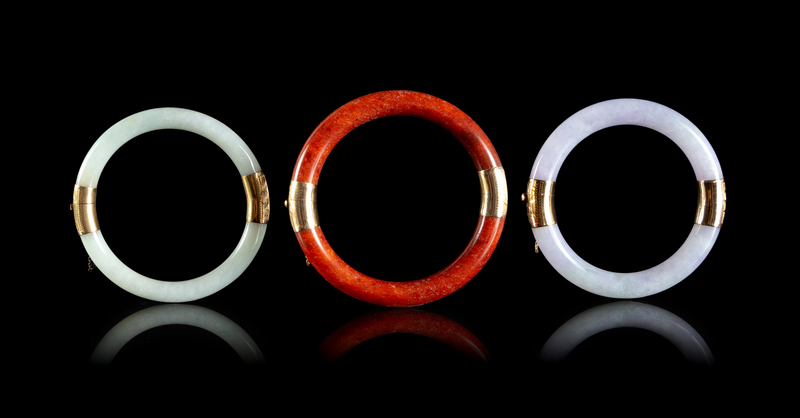 comprising a lavender and a pale celadon jadeite example, a celadon jadeite example and a russet hardstone example, each with 14k yellow gold mountings.