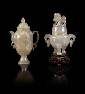 the first a covered tea pot, the ovoid body carved with two cartouches enclosing crane and lingzhi, flowering prunus trees, the upright side spout above a dragon-head suspending a loose ring, all between two bands of overlapping leaves; the second a tripod incense burner, of compressed form, set with a pair of dragon-head handles and loose rings, the domed cover surmounted by a fu lion finial, raised on a fitted hardwood stand.