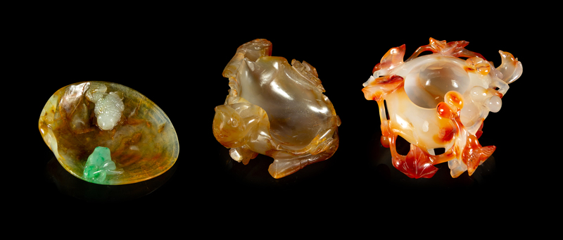 the first a carnelian agate example, carved to the exterior in high relief showing a bird on leafy vines, the second an agate example, in the form of a large lotus leaf, carved to the side showing a frog and lotus springs, the third a quartz example, in the form of a shell, carved to the interior with a frog and a gold fish.