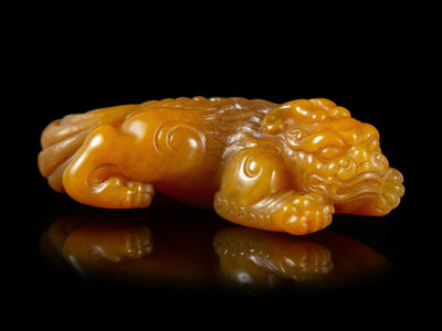 the mythical beast depicted recumbent with all four tucked underneath, the head facing forward, carved with details.