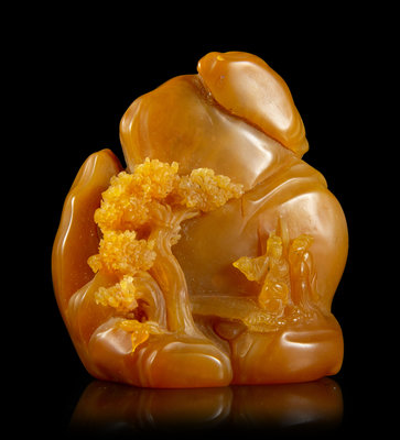 in the form of a rocky mountain, carved to the front in relief depicting a scholar and his attendant crossing a bridge underneath pine trees.