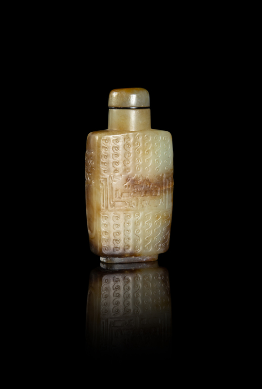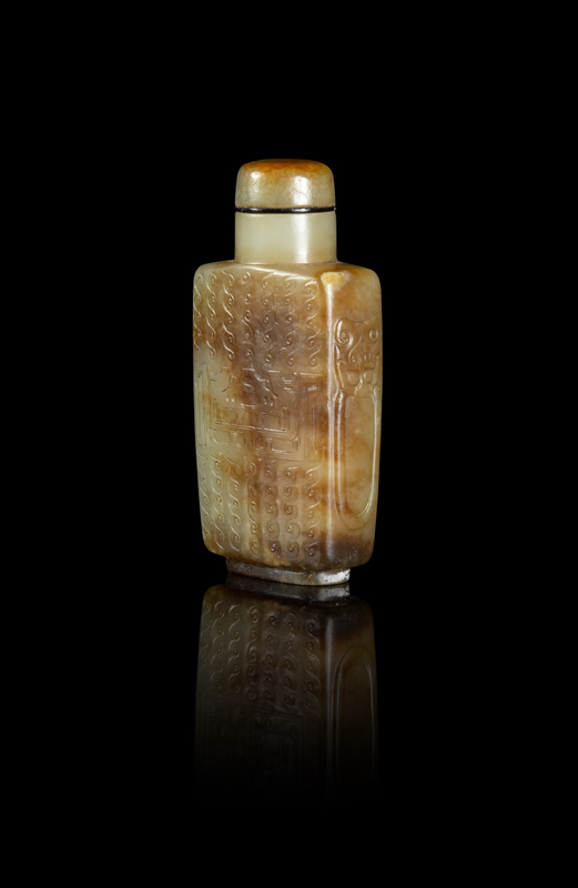 A Russet and Celadon Jade 'Kuilong' Snuff Bottle