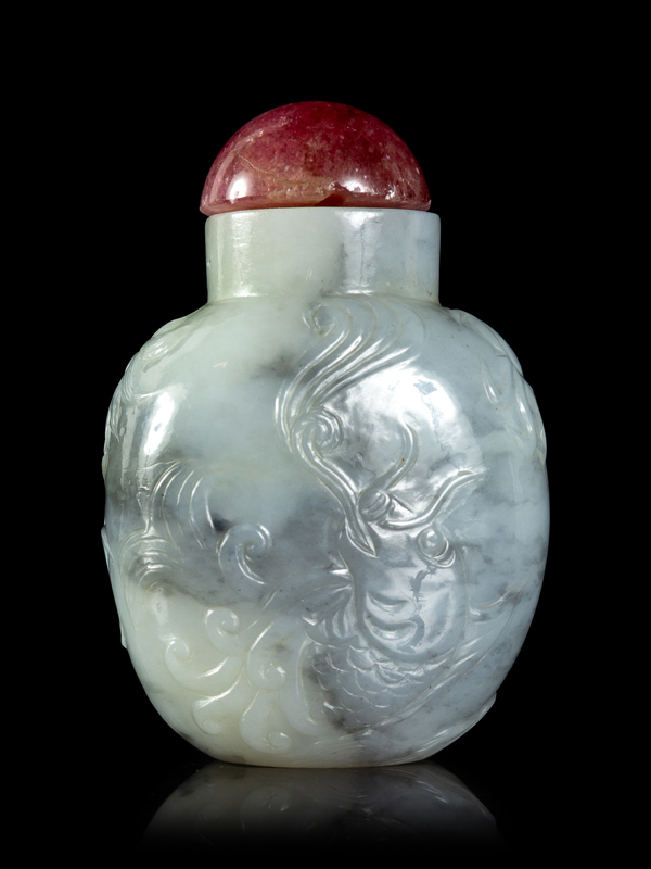 1780-1850年 灰白玉雕鯉魚化龍圖鼻煙壺