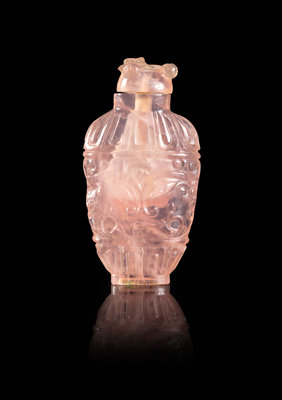 of flattened shield form, carved on both sides with beast masks, between two bands of overlapping leaves, the rose quartz stopper carved with floral blossoms.