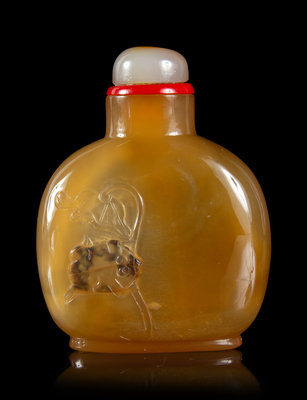 of slightly flattened globular form with shoulders sloping to a cylindrical neck, cleverly carved to the front side with a frog underneath a lotus pad, agate stopper.