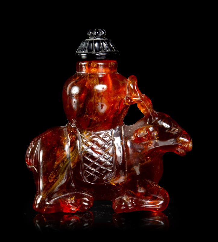 carved recumbent with legs tucked beneath, head looking forwards and a vase rising from its back, the material of a semi-translucent dark honey-brown tone, with stopper.