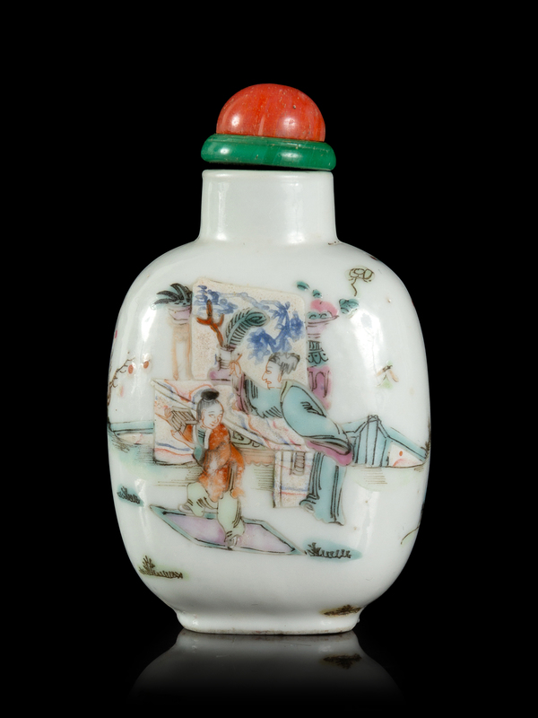 of flattened rounded form, enameled with a scholar teaching a student in the studio and one side and to servant boys in the garden on the reverse, with red coral stopper.