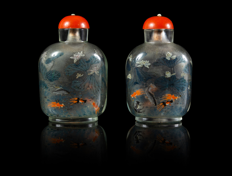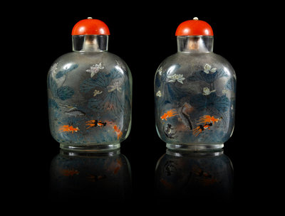 庚戌年(1910) 孟子受作玻璃內畫蓮塘圖鼻煙壺一對