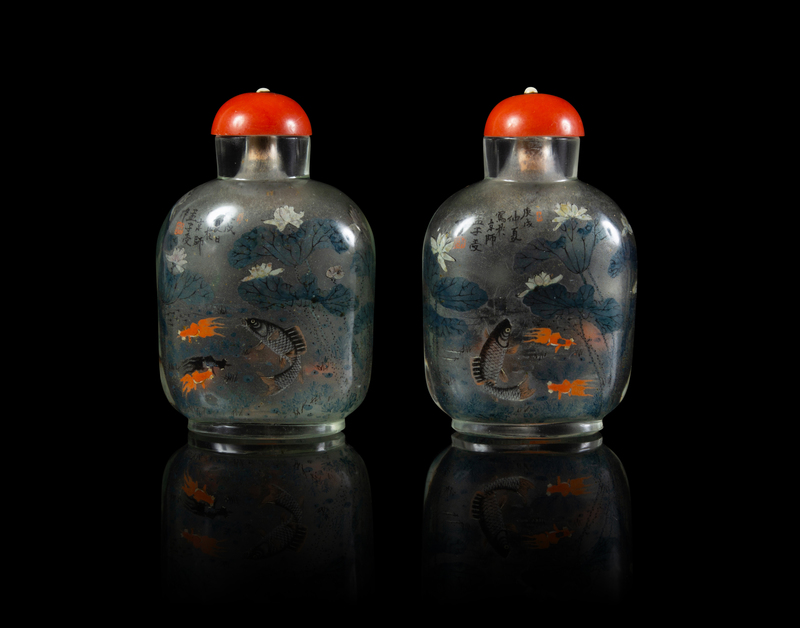 each of flattened rectangular form, finely painted with a continuous scene of gold fish and carp amidst water weeds, signed Meng Zishou, dated summer of the gengxu year, corresponding to 1910, with two seals, Zi and Zishou, agate stoppers.