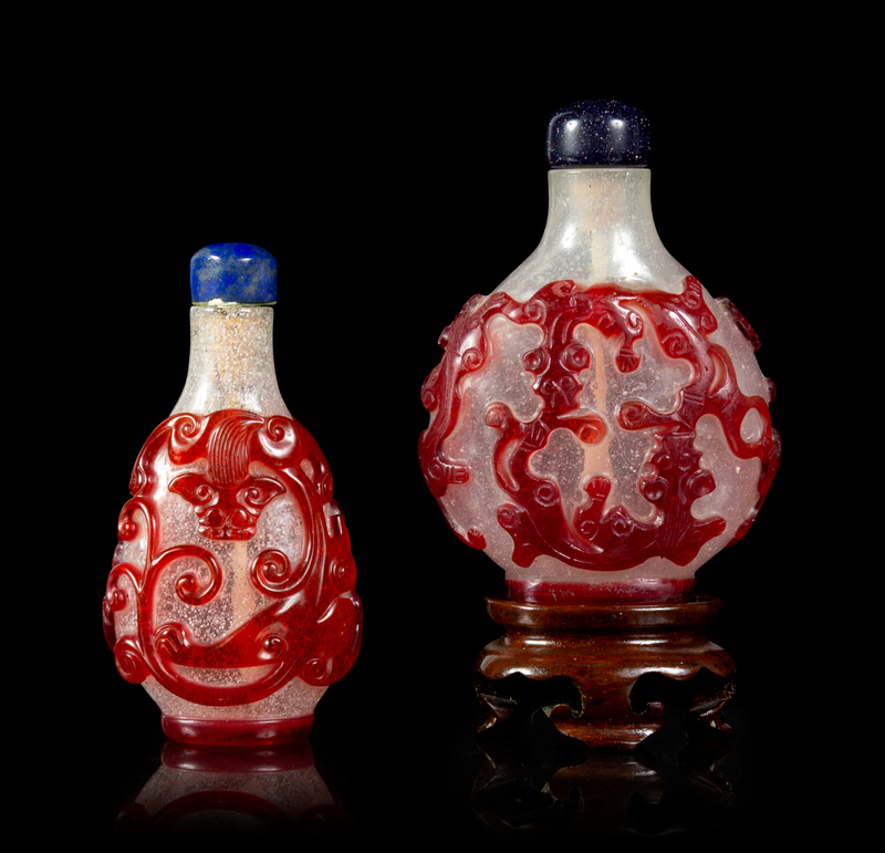 清中期 雪霏地套紅料螭龍紋鼻煙壺兩件