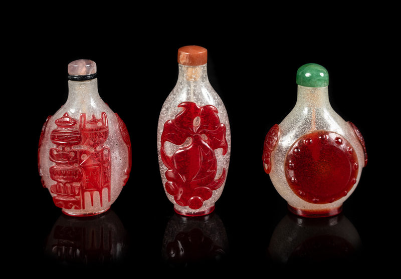Three Red Overlay 'Snowflake' Ground Glass Snuff Bottles