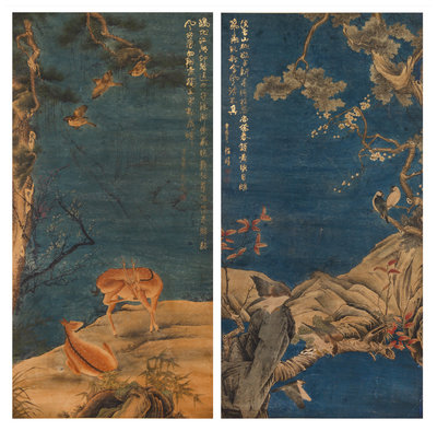 ink and color on paper, two hanging scrolls