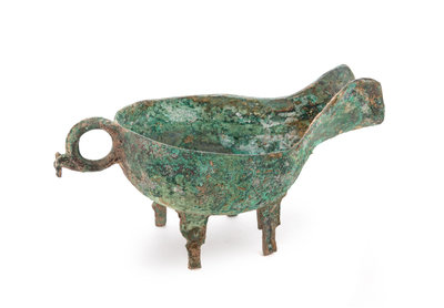 the vessel is fashioned with a loop handle, a u-shaped spout and rounded main body supported on four curved legs, covered overall a pale greyish-green patina with areas of green, russet and blue encrustation.