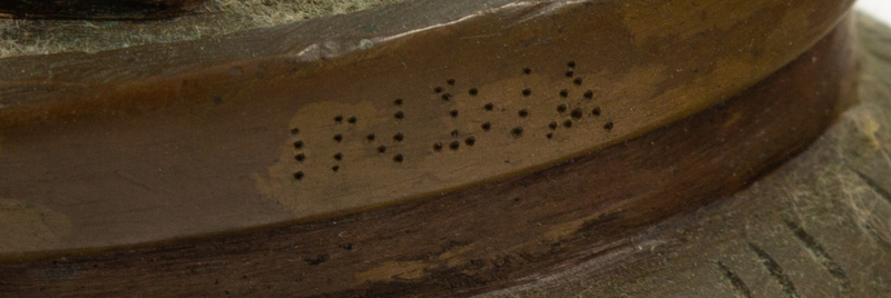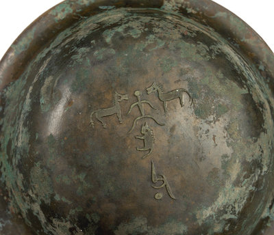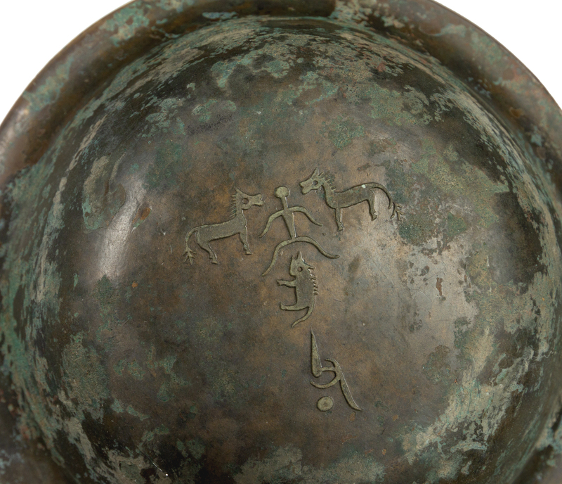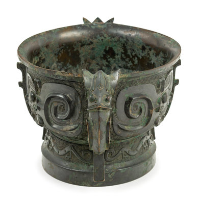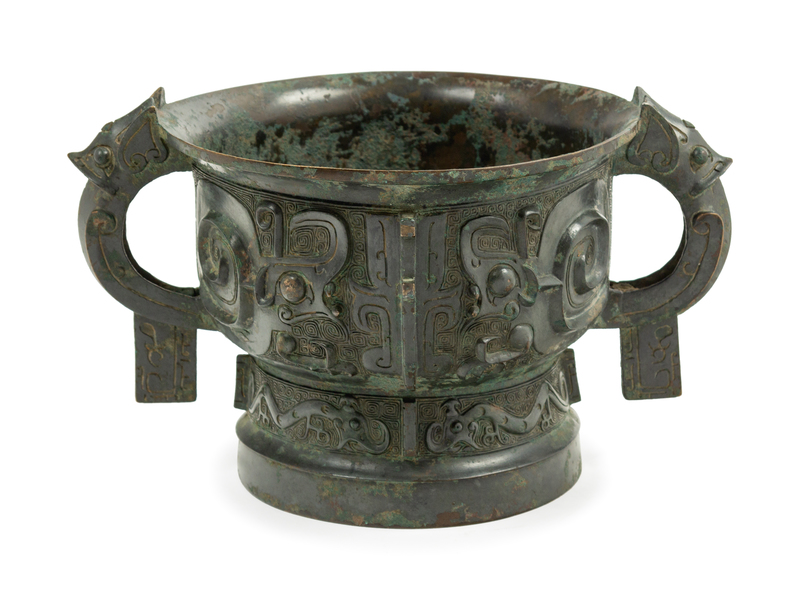 the rounded body supported on a raised foot and rising to a flared mouth, cast with a narrow band of confronting dragons to the foot, and taotie masks to the body, the loop handles surmounted by an animal head and terminate in a pendent tab.