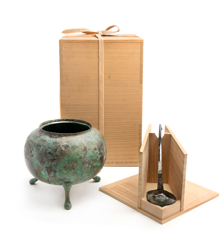 the spherical form body raised above three cabriole legs, surmounted by a short neck with incised lotus petal decoration, the broad shoulders and the base incised with double-line concentric rings; the ladle having an almost hemispherical bowl, the handle decorated with small rings and line borders terminating in a stylized lotus bud finial; together with an original Japanese wood box.