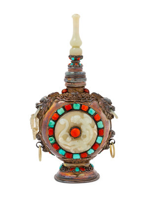 A Mongolian-Style White Jade and Hardstone Inlaid Silver Bottle Vase and Cover