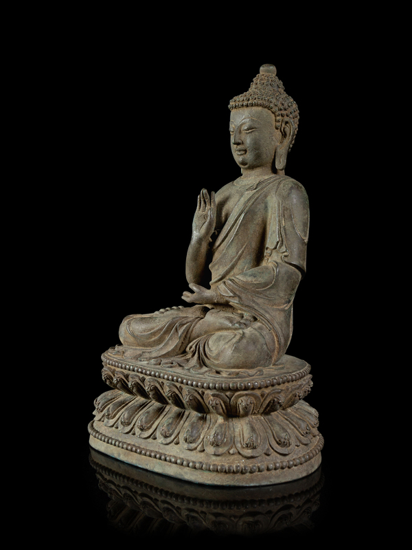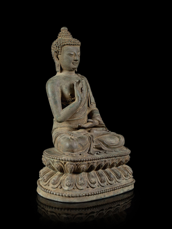 cast seated in dhyanasana on a double-lotus base with left hand in dhyana mudra and right in abhaya mudra, dressed in long flowing robes, the bronze richly patinated to a warm brown color.