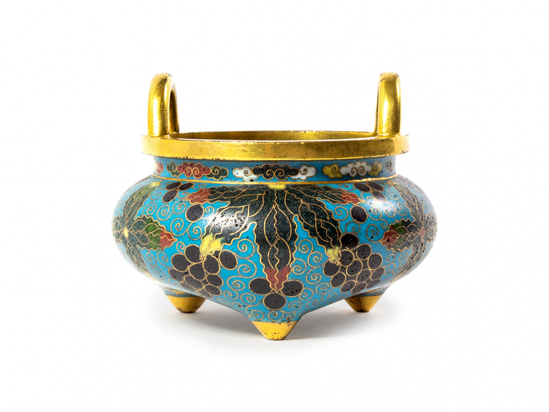 the compressed body rising from three short, tapered gilt legs and narrowing at the neck to the gilt rim set with two upright loop handles, decorated with fruiting grapevine reserved on a turquoise ground。