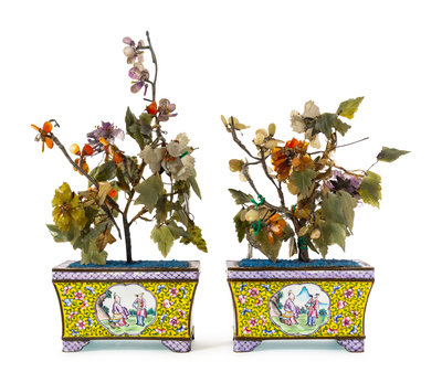 A Pair of Canton Enamel on Copper Cachepot and Plants