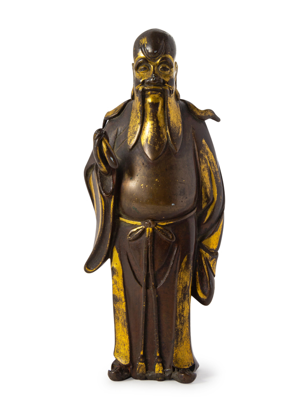 cast as a smiling, bearded god of Longevity, wearing full robes tied with a sash that falls between the feet, with long ribbons trailing from behind the bald head and across the shoulders.