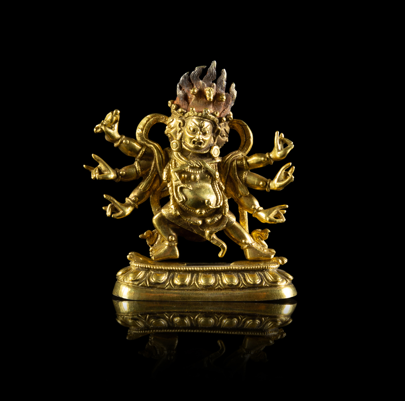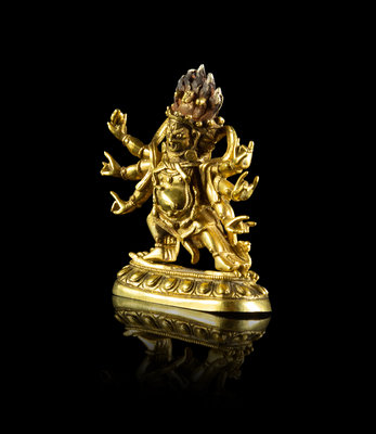 A Small Sino-Tibetan Gilt Bronze Figure of a Six-Armed Yamantaka