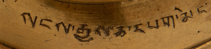 seated in dhyanasana on a double lotus pedestal base with hands held in dhyanamudra, wearing a dhoti falling down over his crossed legs and opening at the chest to reveal elaborate jewelry, a shawl scarf around the arms, the face with serene expression surmounted by a embellished five-point diadem surrounding a chignon, the reverse of the lotus throne chased with a horizontal line of Tibetan characters.