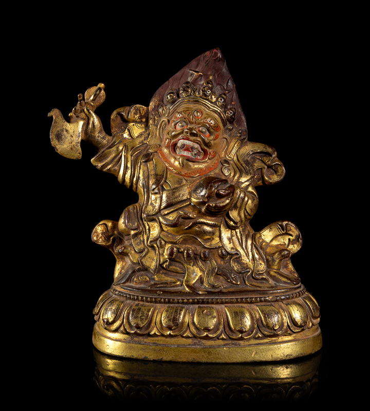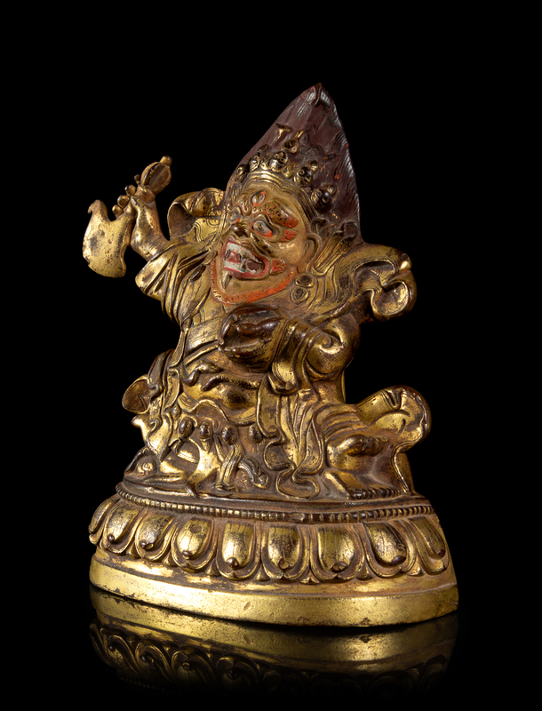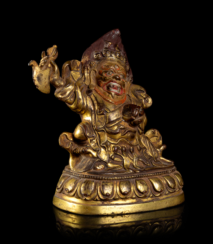 cast seated and holding various implements in both hands, the hair rising in flames with a serpent entwined, secured by a skull tiara and topped with a knop.