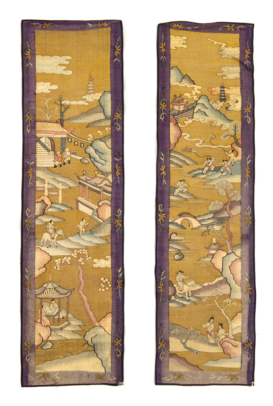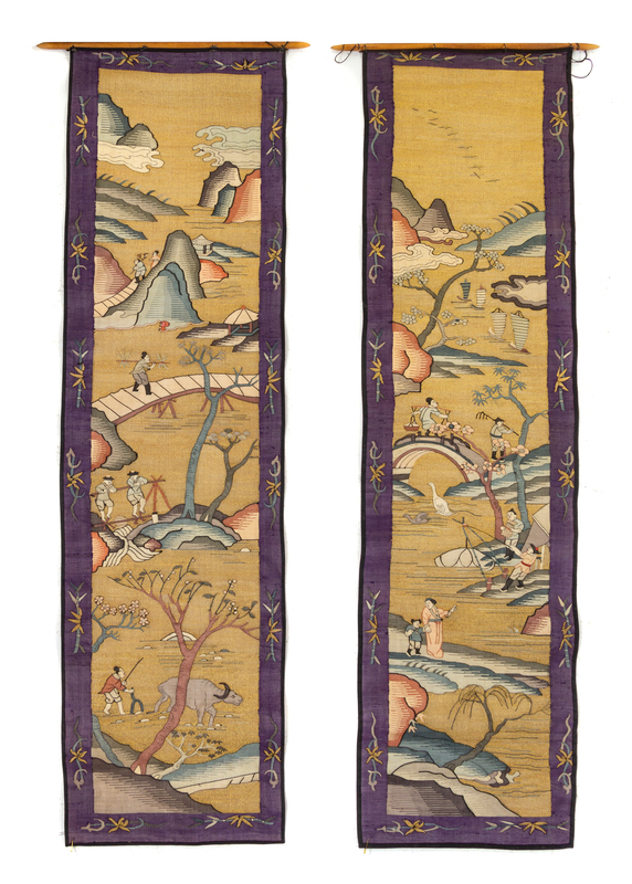 each of rectangular form, woven on the warm beige ground to show figures in a landscape scene. with dark purple borders.