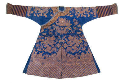 embroidered against a blue silk ground with nine dragons, all above lishui waves supporting the bajixiang emblems, all couched with gold-wrapped silk threads.